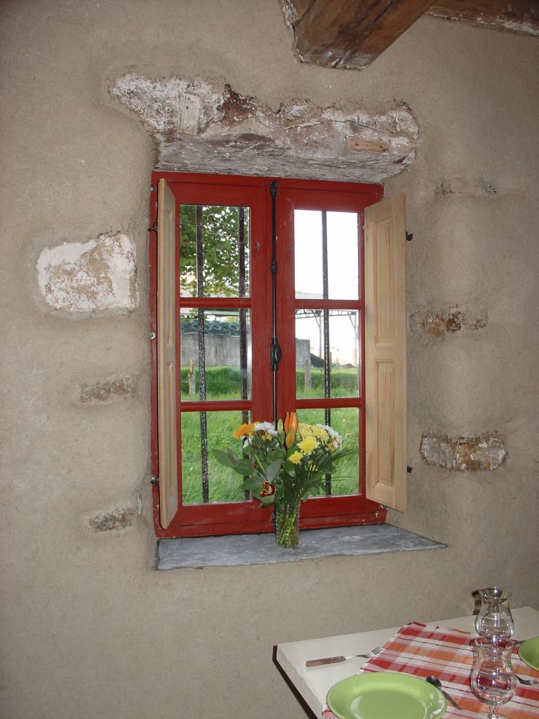 Les murs nord et sud, murs extérieurs, sont enduits en chaux-chanvre pour l'isolation et les murs intérieurs en terre-paille, le tout fait maison.