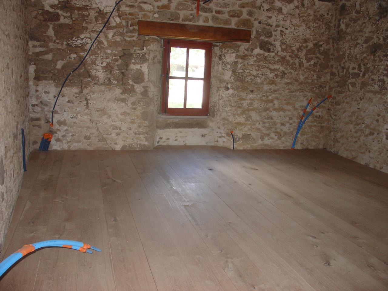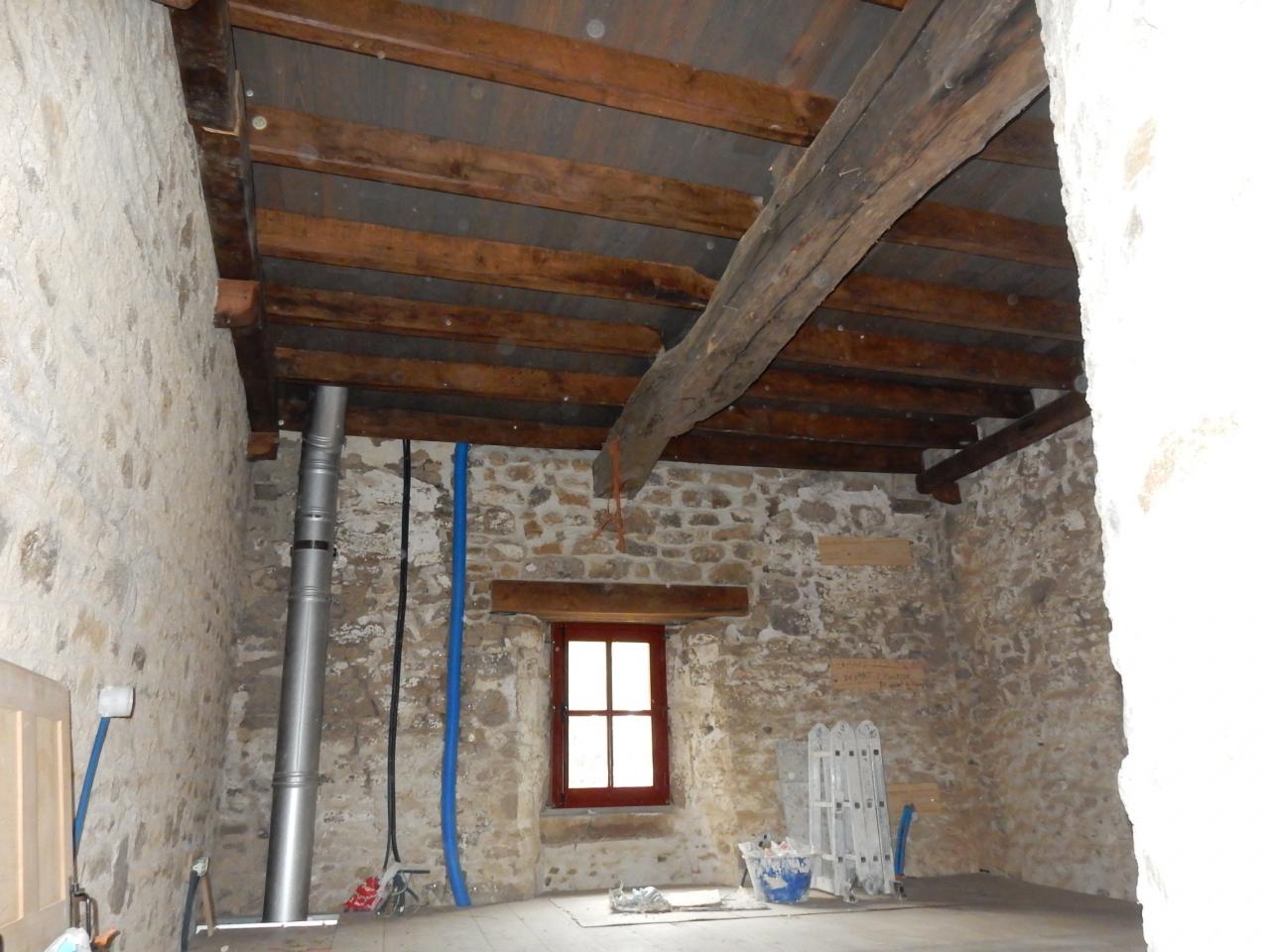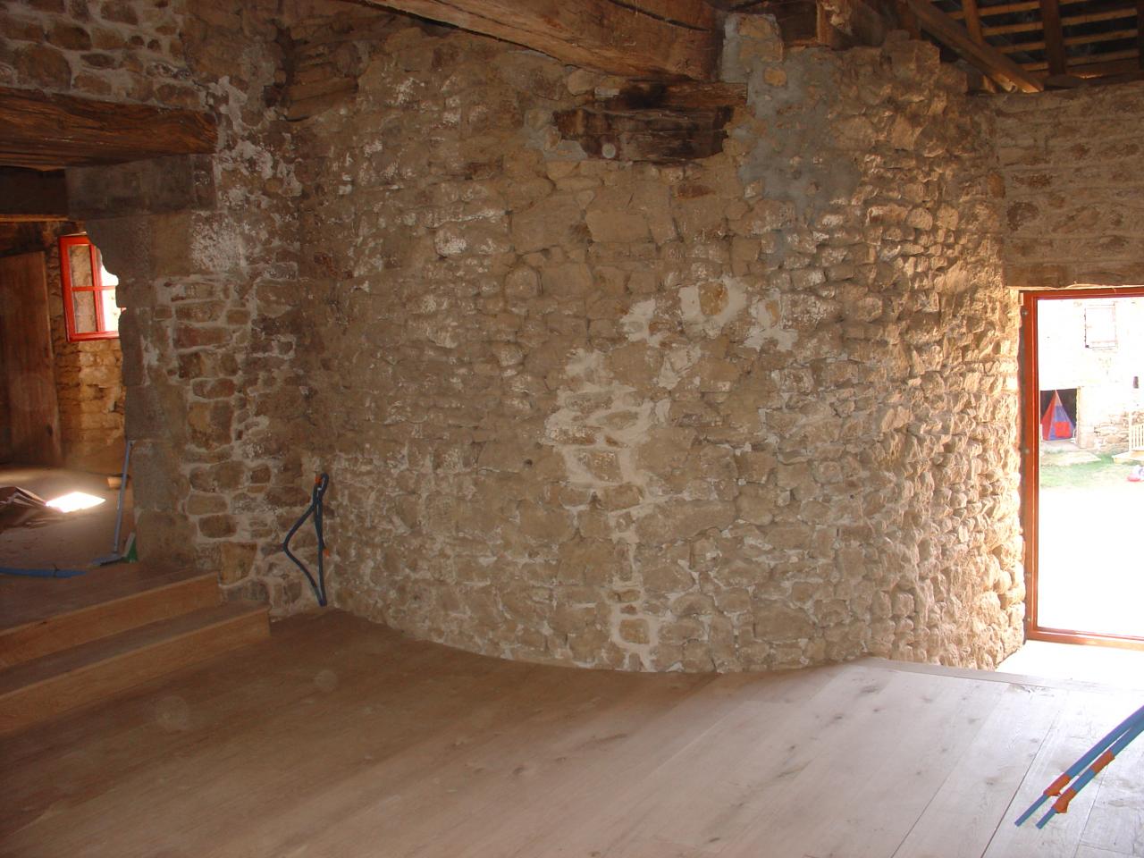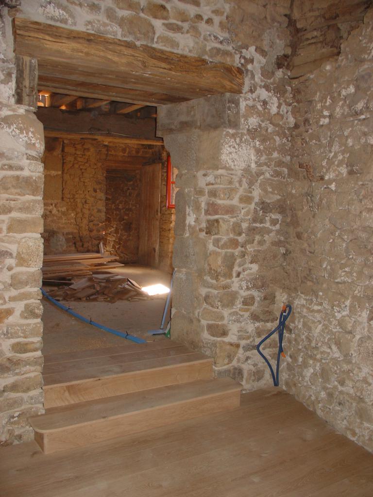 Beaucoup de travaux doivent être effectués... nouveau plancher, créer un plafond avec des poutres de récupération du garage, créer une ouverture d'un accès par l'intérieur, les murs à enduire et la tour à rejointoyer....