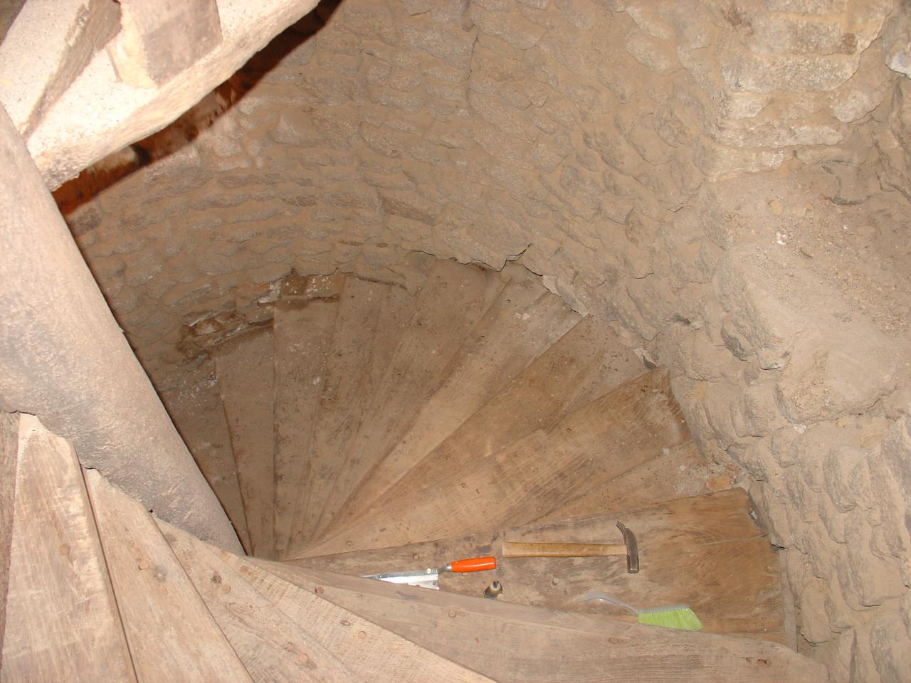 Pour restaurer l'escalier de la tour, nous avons utilisé le plancher de chêne qui faisait office de plafond dans la future salle de bain, autrement dit de vieilles planches en chêne prises sur place. Les contre-marches ont été simplement poncées. Le tout réalisé par la main du maître Paul... il est extraordinaire...