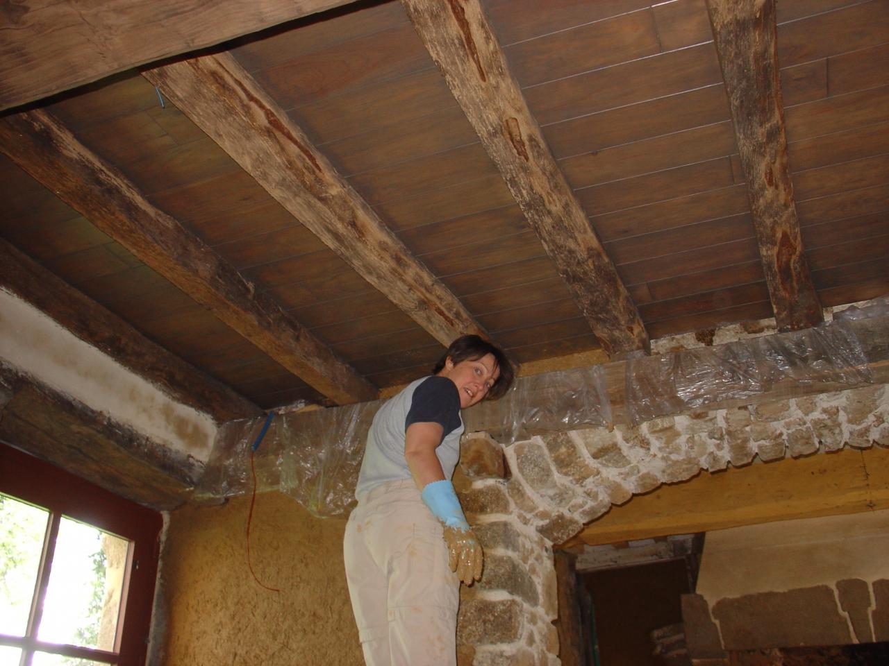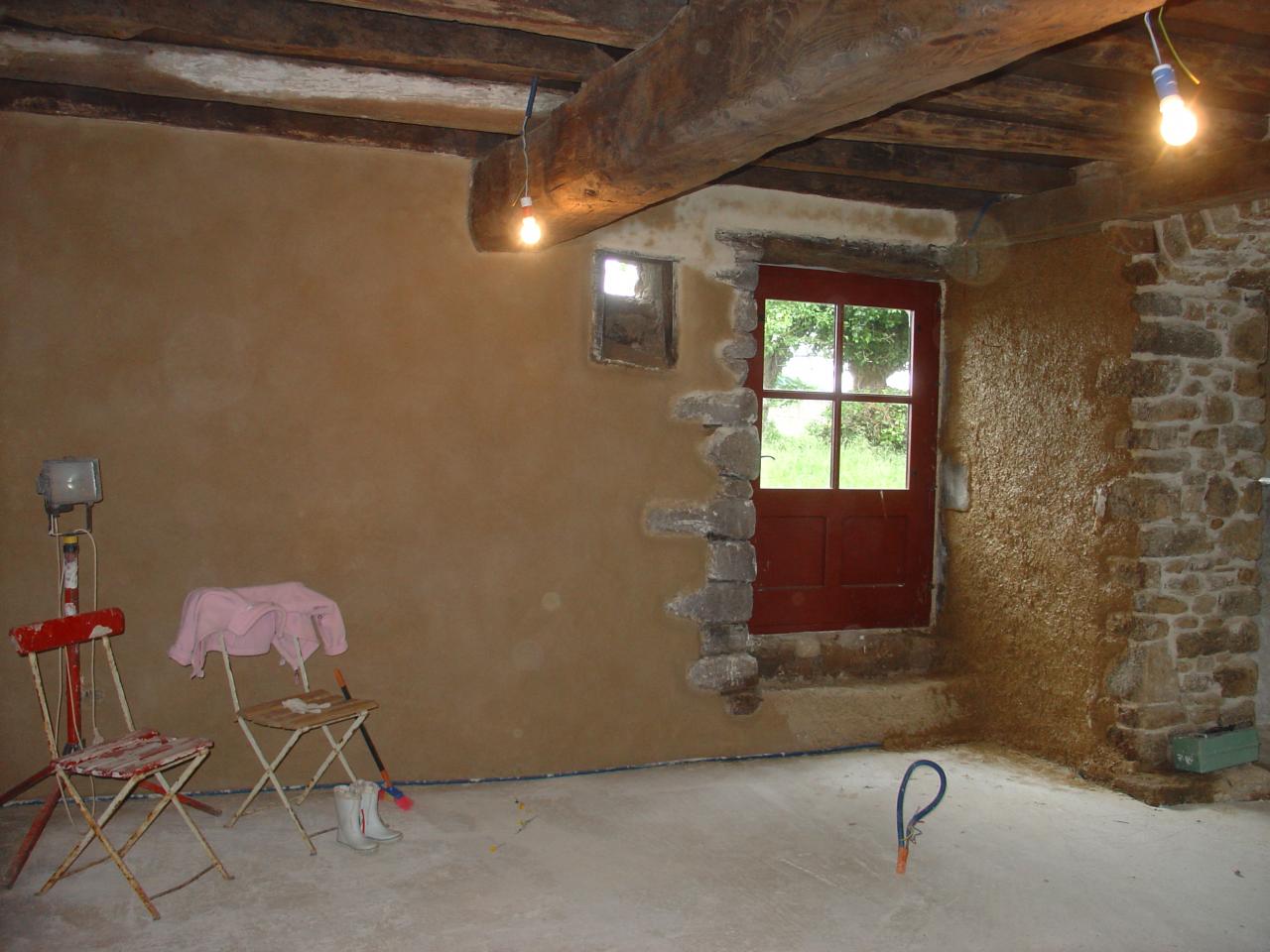 Nous avons décaissé le sol de 70cm (nous n'avons rien trouvé qui s'y serait enterré avec le temps, même pas un petit outil, dommage), nettoyé les murs, on a refait un tout nouveau plafond en sapin tel qu'il était auparavant et on a ouvert une arcade vers la cuisine. Pour la lumière on a mis une porte extérieur avec des carreaux. Les murs extérieurs sont enduits en chaux-chanvre pour l'isolation et les murs intérieurs en terre-paille, les pierres de la tour ont été nettoyées et rejointoyées, le sol est en chêne...